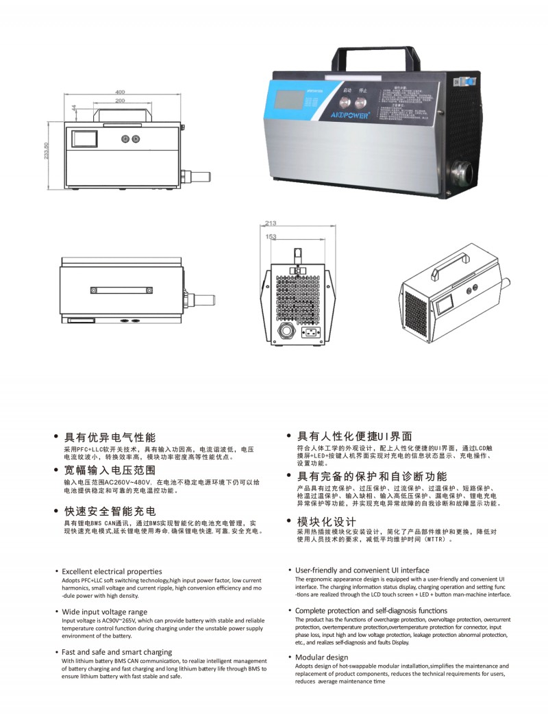 觸摸屏智能操作設(shè)計:告別傳統(tǒng)按鍵方式,給您帶來更現(xiàn)代更具科技智能的操作體驗 自動充電:插槍自動充電,簡化充電流程,便于操作 兼容性高:80V200A兼容48V200A充電 多重保護(hù): 輸出短路,過流過壓保護(hù),反接保護(hù),電流導(dǎo)管保護(hù)等多重保護(hù) 預(yù)約充電功能:避開高峰用電時段,有效節(jié)省成本 雙語切換:中英文雙語隨需切換,跨越語言障礙,與世界接軌 人性化設(shè)計:充電機(jī)背板內(nèi)部附部件明細(xì)及產(chǎn)品接線圖,方便客戶可更清楚的了解產(chǎn)品,便于維修,提高售后時效 獨特設(shè)計: 內(nèi)置電磁鎖驅(qū)動模塊,防止臨時斷電鎖槍 使用壽命更長:功率模塊預(yù)留20%空間,提高模塊的使用壽命 出色內(nèi)部結(jié)構(gòu): 內(nèi)部結(jié)構(gòu)左右出風(fēng),內(nèi)部電路不容易積粉塵,提高充電機(jī)壽命