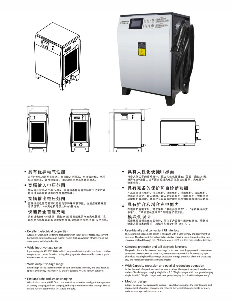 觸摸屏智能操作設計:告別傳統(tǒng)按鍵方式,給您帶來更現(xiàn)代更具科技智能的操作體驗 自動充電:插槍自動充電,簡化充電流程,便于操作 兼容性高:80V200A兼容48V200A充電 多重保護: 輸出短路,過流過壓保護,反接保護,電流導管保護等多重保護 預約充電功能:避開高峰用電時段,有效節(jié)省成本 雙語切換:中英文雙語隨需切換,跨越語言障礙,與世界接軌 人性化設計:充電機背板內(nèi)部附部件明細及產(chǎn)品接線圖,方便客戶可更清楚的了解產(chǎn)品,便于維修,提高售后時效 獨特設計: 內(nèi)置電磁鎖驅(qū)動模塊,防止臨時斷電鎖槍 使用壽命更長:功率模塊預留20%空間,提高模塊的使用壽命 出色內(nèi)部結(jié)構(gòu): 內(nèi)部結(jié)構(gòu)左右出風,內(nèi)部電路不容易積粉塵,提高充電機壽命