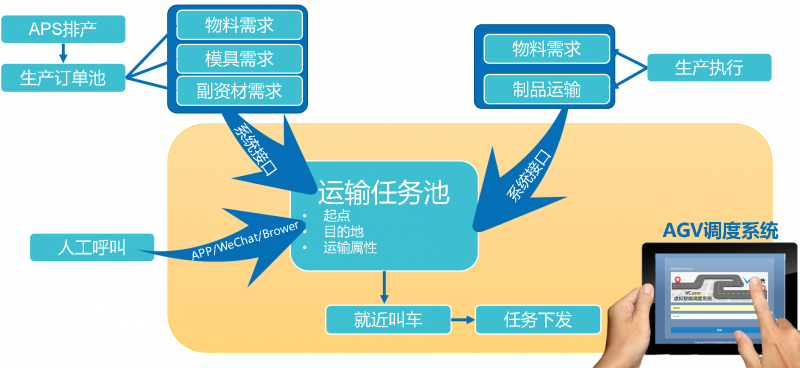 用AGV調度系統(VConn)完成物料計劃下發,現場叫料之間的系統閉環,考慮到異常送料需求,系統保留人工呼叫接口,可以快速與第三方系統或設備對接