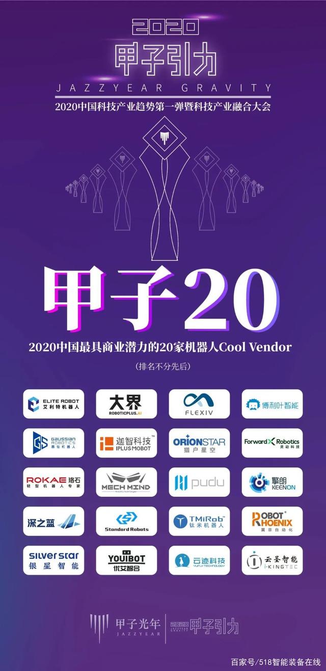 2020年11月14日,由工業和信息化部中國中小企業發展促進中心支持、北京甲子光年科技服務有限公司主辦的2020「甲子引力」大會于北京舉辦。艾得特機器人、大界、非夕科技、博利葉智能、擎朗、高仙機器人、迦智科技、靈動科技、優艾智合、斯坦德、珞石、普渡、深方藍、鈦米機器人、翼菲自動化、銀星智能、運跡科技、云圣智能、梅卡曼德、獵戶星空、等20家入選2020“甲子20”暨2020中國最具商業潛力的20家機器人Cool Vendor。