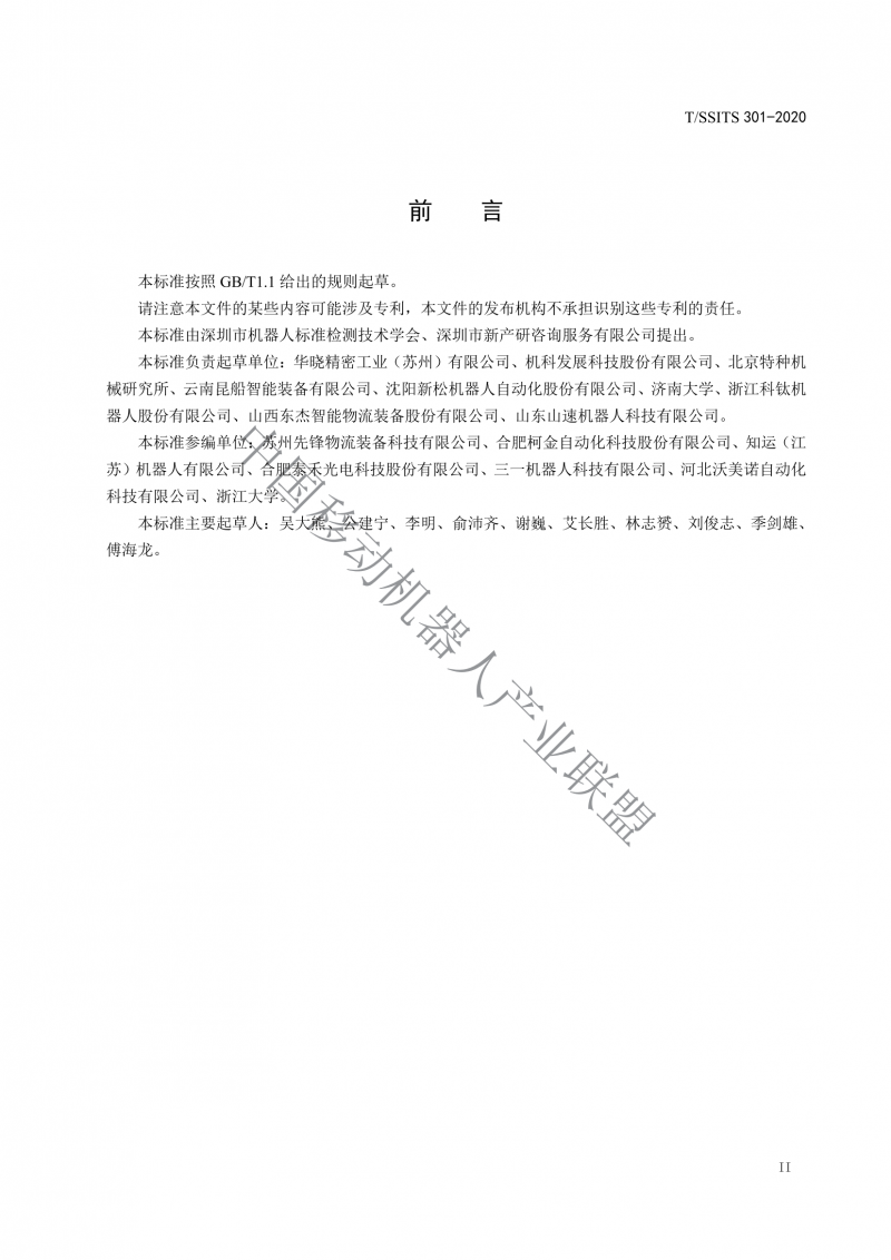 本標準參編單位∶,蘇州先鋒物流裝備科技有限公司、合肥柯金自動化科技股份有限公司、知運(江蘇)機器人有限公司、合肥余禾光電科技股份有限公司、三一機器人科技有限公司、河北沃美諾自動化科技有限公司、浙江大學。?