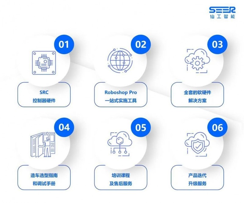 為了幫助客戶更輕松地實現打造 AMR 的需求,仙工能為客戶提供全套方案支持,方案中不僅是一臺 SRC 控制器,而且是涵蓋硬件、軟件、造車技術方案、選型及調試手冊、培訓及服務等全套技術服務,消除一切造 AMR 的障礙。