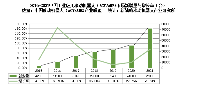 2021年,中國(guó)工業(yè)應(yīng)用移動(dòng)機(jī)器人(AGV)市場(chǎng)呈現(xiàn)出超預(yù)期的高速增長(zhǎng),據(jù)最新發(fā)布的《2021年度中國(guó)工業(yè)應(yīng)用移動(dòng)機(jī)器人產(chǎn)業(yè)發(fā)展研究報(bào)告》顯示,2021年度,中國(guó)市場(chǎng)企業(yè)整體銷(xiāo)售工業(yè)應(yīng)用移動(dòng)機(jī)器人72000臺(tái),較2020年增長(zhǎng)75.61%,市場(chǎng)銷(xiāo)售額達(dá)到126億元,同比增長(zhǎng)64%。