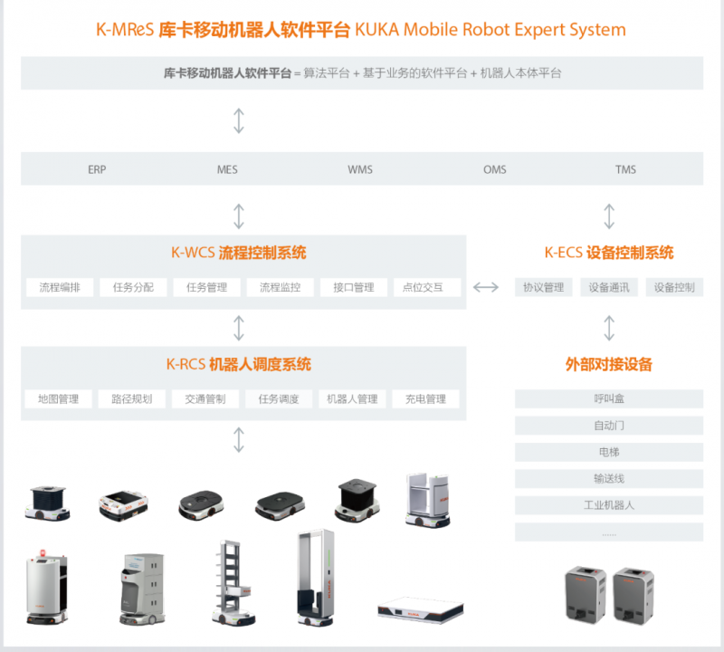 K-ECS系統是庫卡外部設備管理系統,它能實現除了AMR以外的其他硬件設備,如電動門、提升機、電梯、輸送線、工業機器人等設備,接入K-RCS庫卡機器人調度系統,并將信號傳遞給K-WCS流程控制系統,完成對接轉化,實現更智能、更高效的協同作業,助力客戶打造智慧工廠。