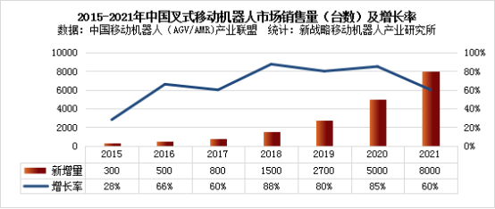 據(jù)中國移動機(jī)器人(AGV/AMR)產(chǎn)業(yè)聯(lián)盟數(shù)據(jù)、新戰(zhàn)略移動機(jī)器人產(chǎn)業(yè)研究所統(tǒng)計(jì),2021年中國叉式移動機(jī)器人(含視覺導(dǎo)航)銷量達(dá)8000臺,同比增長60%,市場規(guī)模約為24.5億元,同比增長42.40%。