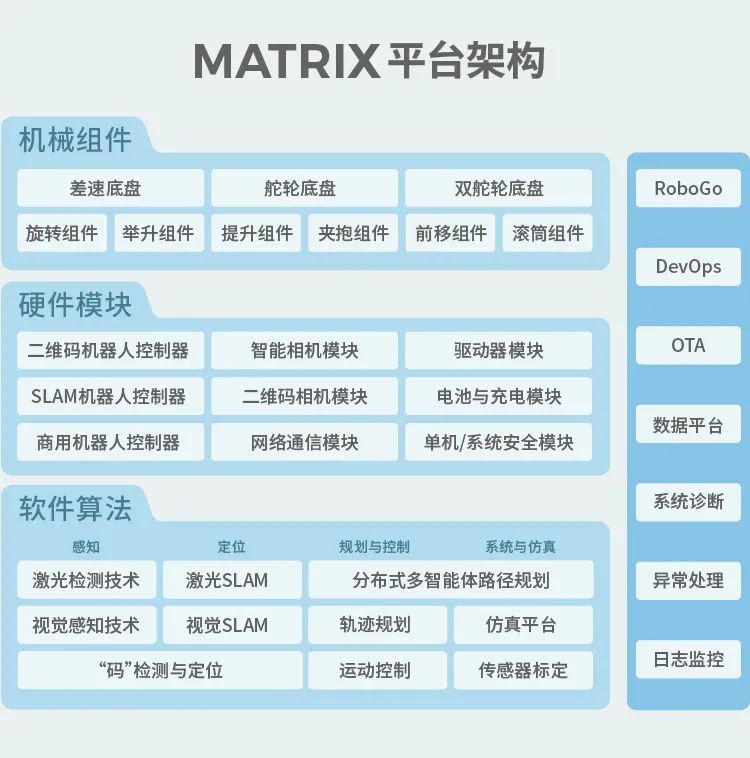 極智嘉擁有全品類全場景覆蓋的產品矩陣,解決不同行業不同場景的客戶痛點。MATRIX平臺作為極智嘉統一的機器人產品技術平臺,以機器人軟件算法為核心,搭配不同的機械組件和硬件模塊,可以有效整合全系列產品的通用技術和功能,快速推出滿足客戶需求的新產品,及時響應客戶需求,實現穩定可靠、低故障率的項目交付。