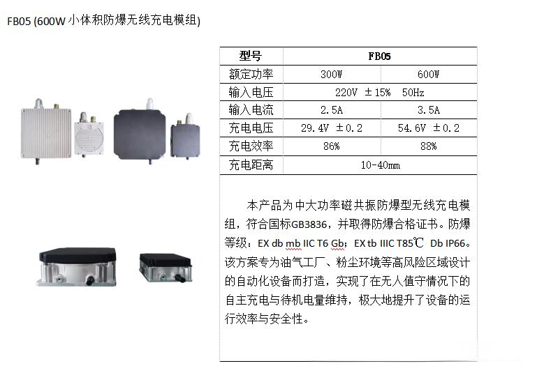 中惠創(chuàng)智FB05具備優(yōu)異的防爆、防塵和耐腐蝕性能。其輸入電壓為220V±15%(50Hz),充電電壓為54.6V±0.2,最大輸入電流3.5A。采用先進(jìn)的磁共振技術(shù),突破了傳統(tǒng)無(wú)線充電距離的限制,能夠在 10 - 40mm 的充電距離內(nèi)實(shí)現(xiàn)穩(wěn)定的自主充電。它的問世,無(wú)疑為高風(fēng)險(xiǎn)區(qū)域自動(dòng)化設(shè)備領(lǐng)域帶來了一場(chǎng)深刻變革。在油氣工廠、粉塵環(huán)境等特殊場(chǎng)景中,它解決了長(zhǎng)期以來困擾企業(yè)的充電安全難題,為自動(dòng)化設(shè)備的穩(wěn)定運(yùn)行提供了堅(jiān)實(shí)保障,推動(dòng)了這些行業(yè)的智能化升級(jí)進(jìn)程。