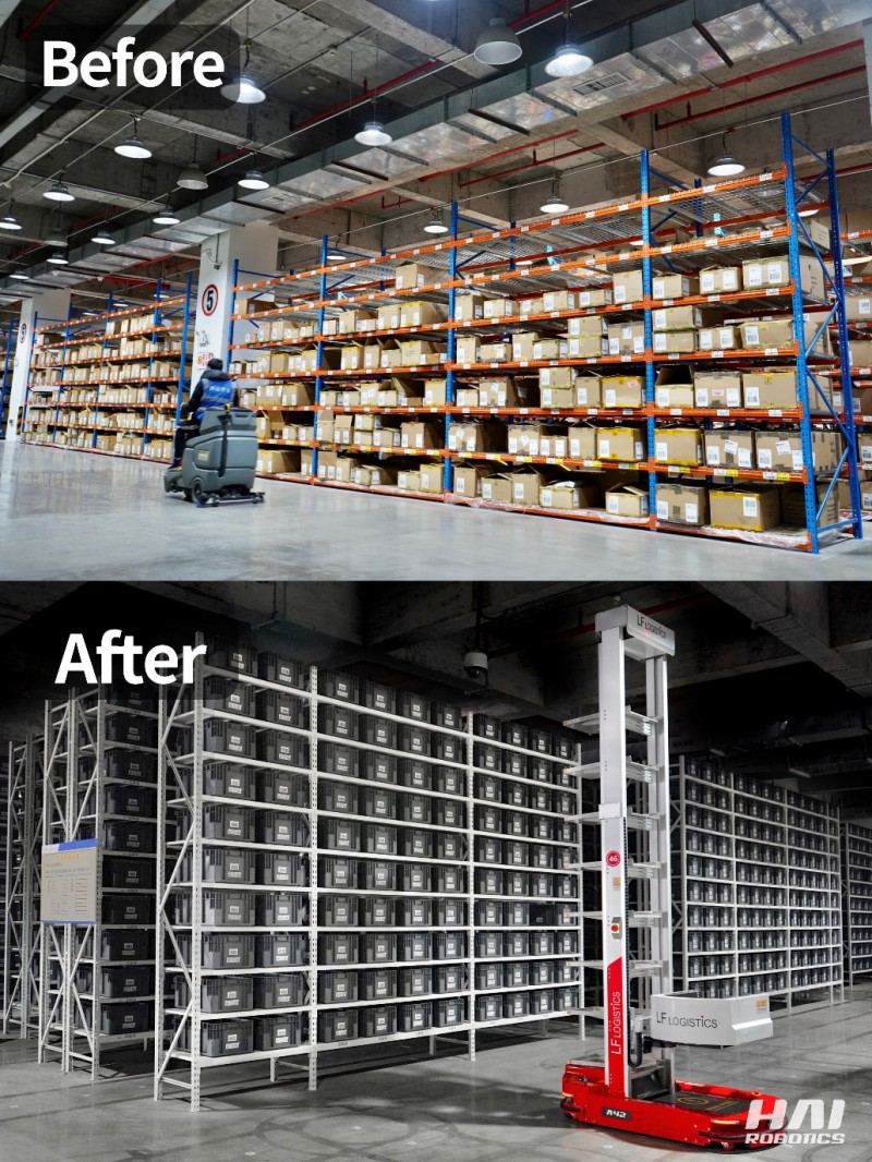 針對利豐供應(yīng)鏈倉庫存儲密度低,存儲壓力大的痛點,海柔創(chuàng)新部署HAIPICK A42箱式倉儲機器人搭配立體貨架的組合存儲方式,其中立體貨架高度可高達4.3米。此外,由于ACR的產(chǎn)品設(shè)計理念是貨箱到人,對比潛伏式移動機器人機身設(shè)計更窄,使得貨架之間的巷道面積得以進一步縮小,從而提升存儲密度。改造后的前海