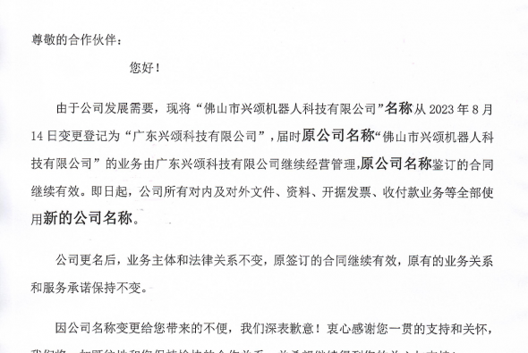 因企業(yè)發(fā)展需要,2023年8月14日我司名稱由佛山市興頌機(jī)器人科技有限公司變更為廣東興頌科技有限公司。在2023年8月14日前,由...