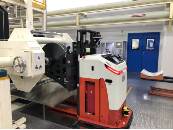 針對電芯中段工藝分切至卷繞/疊片這部分的極卷搬運場景,佳順智能開發了單懸臂AGV,最大負載850KG,結合激光測距和二維碼技術進行精確定位,擁有360°避障雷達、急停按鈕、機械防撞機構、聲光報警等多種避障功能,實現生產安全、穩定運行。