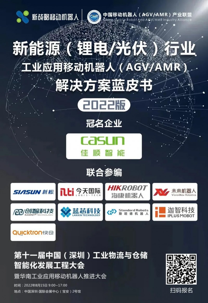 整體來看,目前,新能源行業已經成為AGV/AMR企業的“兵家必爭之地”,市場競爭日趨激烈,為了更好地解析當前新能源行業AGV/AMR應用現狀、競爭格局及未來趨勢,8月15日,在“中國(深圳)工業物流與倉儲智能化發展工程大會”上,中國移動機器人(AGV/AMR)聯盟將聯合多家AGV/AMR企業,發布《新能源行業用移動機器人(AGV/AMR)解決方案藍皮書(2022版)》,敬請期待!