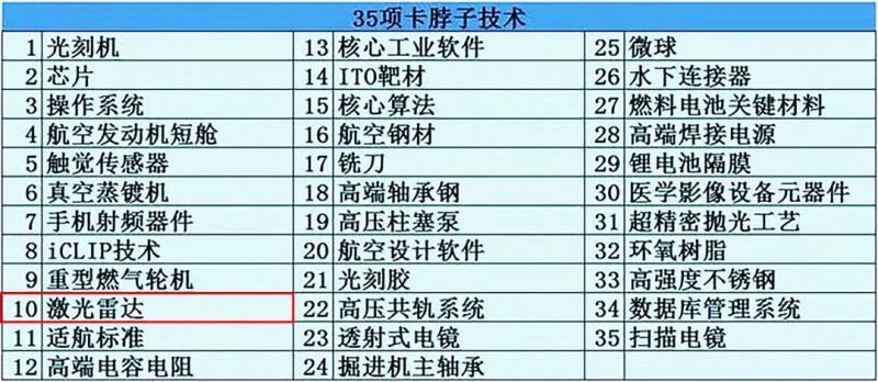 2018年《科技日報》總結了制約我國工業(yè)發(fā)展的35項“卡脖子”技術,其中第十項是激光雷達技術。