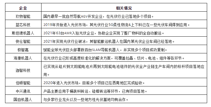 圖表:2021年光伏行業(yè)新增AGV/AMR類型分布整體來(lái)看,當(dāng)前光伏行業(yè)的AGV/AMR應(yīng)用還處于前期的階段,整體需求還未完全釋放,競(jìng)爭(zhēng)相對(duì)較低,但伴隨著光伏行業(yè)近兩年投資擴(kuò)產(chǎn)風(fēng)潮的盛行,以及光伏企業(yè)對(duì)AGV/AMR產(chǎn)品認(rèn)知度的不斷提高,光伏行業(yè)對(duì)AGV/AMR需求也在逐步放量。當(dāng)前,光伏行業(yè)已經(jīng)成為AGV/AMR企業(yè)重點(diǎn)布局領(lǐng)域之一。由于光伏行業(yè)對(duì)AGV/AMR的需求以自然導(dǎo)航類為主,當(dāng)前,聚焦光伏行業(yè)的AGV/AMR企業(yè)也大部分以專注于自然導(dǎo)航(SLAM)類產(chǎn)品的企業(yè)為主,如藍(lán)芯科技、斯坦德、快倉(cāng)智能、極智嘉、??禉C(jī)器人、迦智科技、佳順智能、中興通訊、玖物互通等。這些企業(yè)依托自然導(dǎo)航核心技術(shù),結(jié)合光伏行業(yè)需求特點(diǎn),也相繼形成了光伏行業(yè)解決方案。