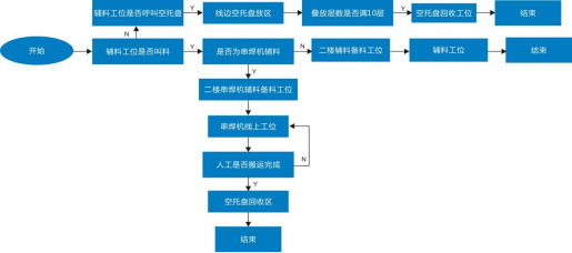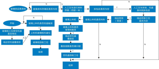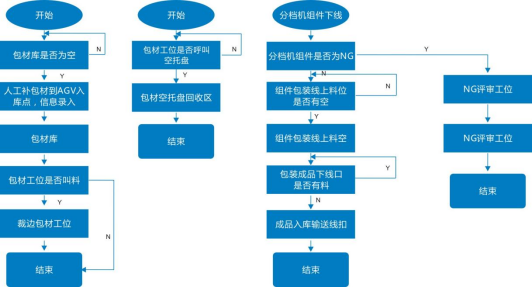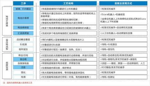 圖表:光伏行業(yè)關(guān)節(jié)機(jī)器人應(yīng)用現(xiàn)狀關(guān)節(jié)機(jī)器人主要運(yùn)用在了電池片焊接、排版、裝邊框、注膠等環(huán)節(jié),而移動(dòng)機(jī)器人主要用于不同工序之間的工序?qū)印?/span>在光伏行業(yè)生產(chǎn)線上,從上游到下游需要用到多種不同類型的AGV。一般會(huì)用到叉車AGV對(duì)冶金級(jí)別的硅礦(若原料為太陽(yáng)能級(jí)多晶硅材料,則采用潛伏頂升式AGV)等原材料進(jìn)行運(yùn)輸,將原料送上產(chǎn)線進(jìn)行裝料,在高純度石英干過(guò)中按層次裝入塊料、粉料、顆粒料、摻雜劑然后放入石墨坩堝合爐,再進(jìn)行抽空檢漏→壓力化→化料→引晶→縮頸→放肩→轉(zhuǎn)肩→等徑生長(zhǎng)→收尾、停爐的步驟。電池生產(chǎn)工藝環(huán)節(jié)空間適中,標(biāo)準(zhǔn)化程度高,規(guī)模較大。在傳統(tǒng)生產(chǎn)模式中有大量的工藝對(duì)接及半成品上下料搬運(yùn)對(duì)接由人工完成,在人員、流程管理、同步時(shí)效性上對(duì)用戶有一定困難及挑戰(zhàn):①生產(chǎn)現(xiàn)場(chǎng)要求24小時(shí)連續(xù)作業(yè),作業(yè)人員3班輪替,勞動(dòng)強(qiáng)度大,導(dǎo)致人員流動(dòng)性較大,企業(yè)管理成本劇增;②人工在生產(chǎn)設(shè)備前上料時(shí),雙手只能同時(shí)操作單個(gè)電池片載具依次上料,效率低下;③生產(chǎn)工藝復(fù)雜,對(duì)物料上料時(shí)的擺放、朝向、整齊度都有嚴(yán)格要求,要求作業(yè)人員低容錯(cuò)率和規(guī)范化作業(yè),如在太陽(yáng)能電池片生產(chǎn)過(guò)程中,有一道工序是將硅片插入花籃中,并將插滿硅片的花籃運(yùn)輸至其它工藝設(shè)備處,以進(jìn)行后續(xù)生產(chǎn)作業(yè)。為了將硅片準(zhǔn)確地插入花籃中,一般通過(guò)工作人員人工操作,一片一片地將硅片插入花籃中。此外,將插滿硅片的花籃運(yùn)輸至其它工藝設(shè)備處也是通過(guò)工作人員人工搬運(yùn)實(shí)現(xiàn)的。由于硅片本身具有薄、脆等特點(diǎn),因此,相關(guān)技術(shù)在將硅片插入花籃中時(shí),容易因?yàn)楣ぷ魅藛T力道不均而損壞硅片。④不同工藝環(huán)節(jié)之間由人工完成物料的搬運(yùn)與上料,中間環(huán)節(jié)物料信息缺失,異常原因難以追溯。為了解決傳統(tǒng)人工模式存在的種種問(wèn)題,光伏廠商開(kāi)始在電池片生產(chǎn)車間引進(jìn)AGV/AMR,實(shí)現(xiàn)從發(fā)料至下線,及生產(chǎn)中制絨、擴(kuò)散、激光、刻蝕、退火氧化、鍍膜、背膜、正膜、絲網(wǎng)印刷等工藝的對(duì)接搬運(yùn),實(shí)現(xiàn)硅料、硅片安全高效的自動(dòng)化轉(zhuǎn)運(yùn)。當(dāng)前,在電池片生產(chǎn)流程中,主要應(yīng)用的AGV/AMR車型有兩種,分體式與一體式AGV,分體式AGV是直接頂升貨架,再與自動(dòng)化設(shè)備或者主機(jī)臺(tái)工藝設(shè)備進(jìn)行對(duì)接,一體式AGV則是上方會(huì)有傳輸帶(如輥道等)配件,可直接作為生產(chǎn)線傳輸帶的一部分。玻璃原片上料—EVA裁切鋪設(shè)—自動(dòng)上模板—自動(dòng)串焊—自動(dòng)擺串—上背玻—EL測(cè)試單元—緩存堆棧—混進(jìn)定位單元—層壓機(jī)—混出定位單元—自動(dòng)修邊—翻轉(zhuǎn)檢查單元—自動(dòng)裝框—上料機(jī)—固化—清洗--下料機(jī)—絕緣耐壓測(cè)試—IV測(cè)試單元—自動(dòng)分檔—自動(dòng)包裝—自動(dòng)出入庫(kù)等。組件生產(chǎn)AGV自動(dòng)小車自動(dòng)按需運(yùn)輸流程大致流程如下:
