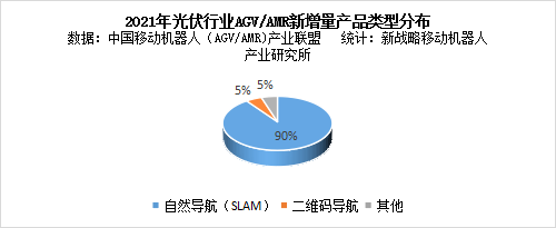 圖表:2021年度工業(yè)移動(dòng)機(jī)器人主要應(yīng)用市場(chǎng)根據(jù)中國(guó)移動(dòng)機(jī)器人(AGV/AMR)產(chǎn)業(yè)聯(lián)盟數(shù)據(jù)、新戰(zhàn)略移動(dòng)機(jī)器人產(chǎn)業(yè)研究所統(tǒng)計(jì)顯示,2021年光伏行業(yè)新增AGV/AMR中,自然導(dǎo)航(SLAM)占比超過(guò)90%;其次是二維碼導(dǎo)航,占比約為5%;其他約為5%。目前光伏行業(yè)呈現(xiàn)出技術(shù)快速迭代的現(xiàn)狀,柔性化、定制化、快速更新是行業(yè)發(fā)展的趨勢(shì),對(duì)設(shè)備的柔性化要求很高,因此,當(dāng)前光伏工廠所應(yīng)用AGV/AMR基本以自然導(dǎo)航(SLAM)產(chǎn)品為主。