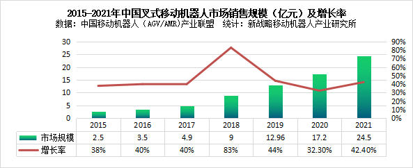 圖表:2015-2021年中國叉式移動機器人市場銷售規(guī)模(億元)及增長率