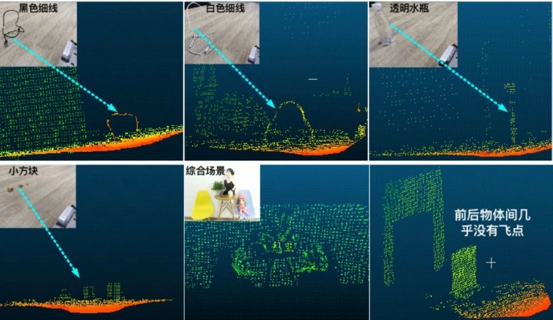 實拍場景與3D點云,可以看到dToF不僅在綜合場景中表現(xiàn)優(yōu)秀,對小物體,細線甚至透明物體等極端場景都有非常好的表現(xiàn),并且相對于其他ToF技術(shù),dToF在飛點(前后物體邊界難以區(qū)分造成的)的表現(xiàn)上有天然優(yōu)勢。![]()