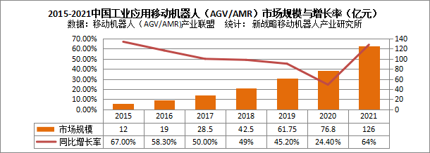 中國市場,根據移動機器人(AGV/AMR)產業聯盟數據、新戰略移動機器人產業研究所統計,2021年度,中國市場企業整體銷售工業應用移動機器人(AGV/AMR)72000臺,較2020年增長75.61%,市場銷售額達到126億元(海外銷售25億元),同比增長64%。其中營收超億元的企業達到36家,同比增長50%。隨著我國工業智能化步伐加快,AGV/AMR機器人的應用得到了飛速的提升,已成為制造業常用的智能搬運設備,并成熟滲透到智能倉儲、汽車、煙草、醫藥、食品、化工、印刷、3C電子等各類型的制造業當中。在制造業領域,AGV應用空間仍存在巨大的發展潛力。2022年,根據移動機器人(AGV/AMR)產業聯盟數據、新戰略移動機器人產業研究所初步統計,中國移動機器人市場規模增長預計超過40%。