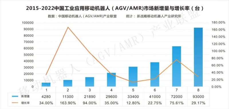 圖表:2015-2022中國(guó)工業(yè)應(yīng)用移動(dòng)機(jī)器人(AGV/AMR)新增量與增長(zhǎng)率