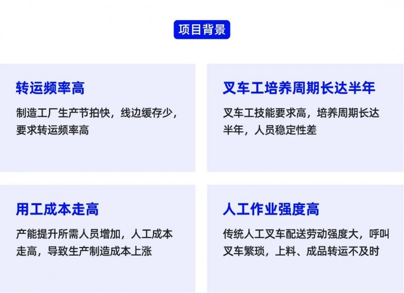 汽車行業生產制造節奏快,生產節拍緊湊,對場內物流轉運頻率要求高。一個生產制造原料的延遲或將導致整個產線的停滯、延后,嚴重影響整個工廠的生產效率。