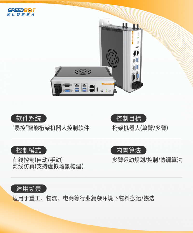 SpeedTruss智能桁架控制器主要用于多臂共軸桁架機器人(N≥1)的運動控制,運用自主研發的桁架運動規劃、多臂協同運動控制、無碰運動協調等算法技術,為智能產線提供靈活、精準、高效的多臂桁架運動控制方案。用戶只需調用控制器提供的高級任務指令接口(如將某臺桁架臂移動到目標位置K),即可實現對桁架機器人運動軌跡的自動控制與協調,保障各個桁架臂高效無碰協同運動,有效提升生產效率。