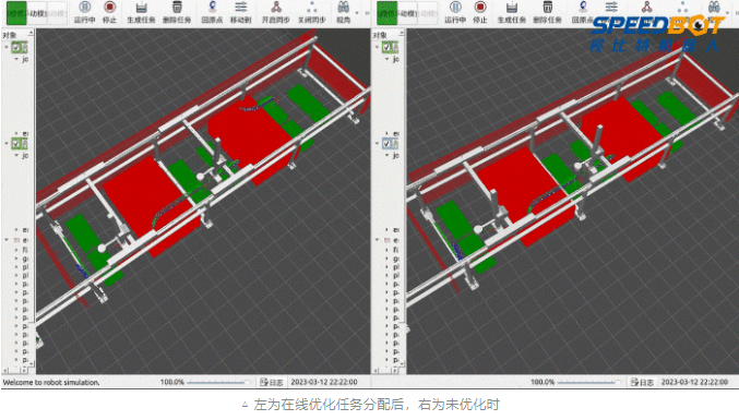 在多任務場景下,桁架機器人存在多個共軸的機械臂,不同臂在工作空間內的任務時序直接影響整體作業效率。SpeedTruss智能桁架控制器建立了基于時空約束的最優任務分配模型,最大限度地提高工作效率。