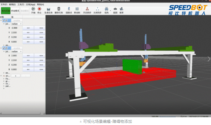 · 可視化場景編輯,用戶可在界面狀態欄中進行障礙物方位的修改、移除或添加,實現對桁架機器人的柔性控制。