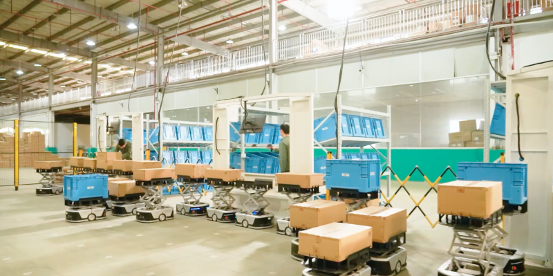 RS貨箱機器人與P40揀選機器人可實現(xiàn)同一場景下的并行高效協(xié)作,由RS料箱機器人負責貨箱在存儲位和緩存位間的上下轉(zhuǎn)移,P40揀選機器人從緩存位快速搬運貨箱至工作站進行揀選。