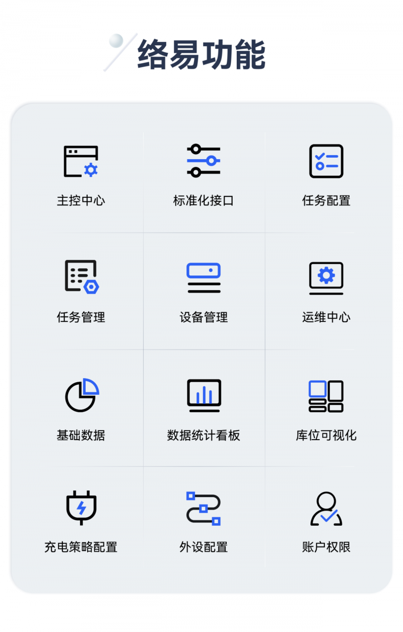 絡(luò)易的功能強(qiáng)勁,能滿足工廠和倉(cāng)儲(chǔ)場(chǎng)景中小型項(xiàng)目的庫(kù)位管理、任務(wù)管理、車輛管理及容器管理等十大功能需求。也能通過(guò)標(biāo)準(zhǔn)任務(wù)接口連通上游系統(tǒng),靈活接受各種任務(wù),并智能適配載具,滿足不同作業(yè)場(chǎng)景內(nèi)“點(diǎn)到點(diǎn)”、“點(diǎn)到區(qū)域”、“區(qū)域到區(qū)域”的搬運(yùn)需求。