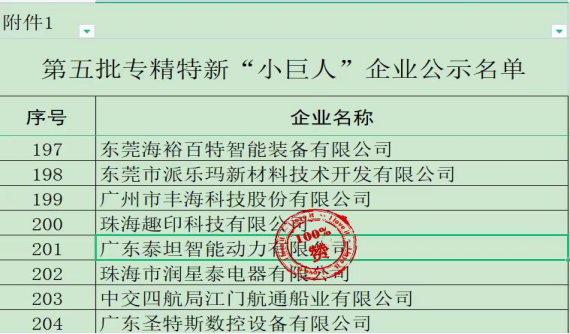 2023年7月14日,廣東省工業(yè)和信息化廳發(fā)布了《關(guān)于廣東省第五批專精特新“小巨人”企業(yè)和第二批專精特新“小巨人”復(fù)核通過企業(yè)名單的公示》,廣東泰坦智能動(dòng)力有限公司通過國家級(jí)專精特新企業(yè)審核,榮獲“小巨人”稱號(hào)。