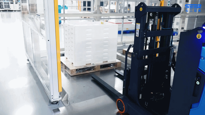 智能叉車可用于搬運、堆垛、舉升貨物,在該車間內用于貨物跨區轉運。