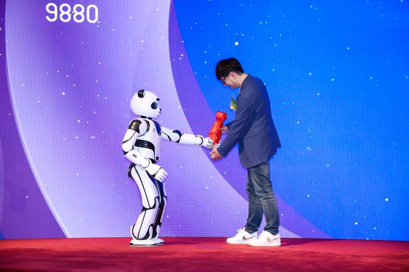 圖片2:熊貓機(jī)器人優(yōu)悠將鑼錘遞給優(yōu)必選董事會(huì)主席、執(zhí)行董事兼行政總裁周劍