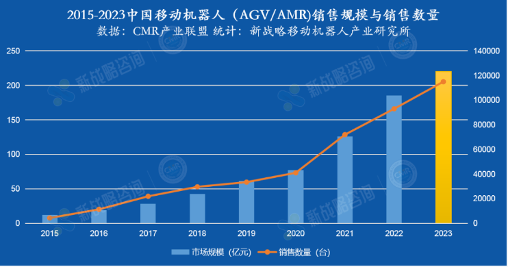 圖表:2015-2023中國AGV/AMR銷售數(shù)量與市場(chǎng)增長(zhǎng)率