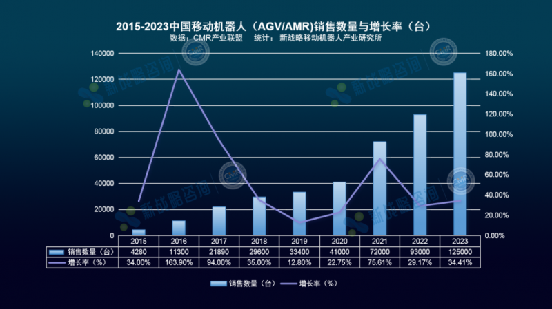 根據(jù)CMR產(chǎn)業(yè)聯(lián)盟數(shù)據(jù),新戰(zhàn)略移動(dòng)機(jī)器人產(chǎn)業(yè)研究所統(tǒng)計(jì),從2015年至2023年,中國市場移動(dòng)機(jī)器人(AGV/AMR)產(chǎn)業(yè)年復(fù)合增長率達(dá)43.18% ;2023年中國移動(dòng)機(jī)器人(AGV/AMR)銷售規(guī)模212億,同比增長14.59%;銷售數(shù)量125000臺(tái),同比增長34.41%。