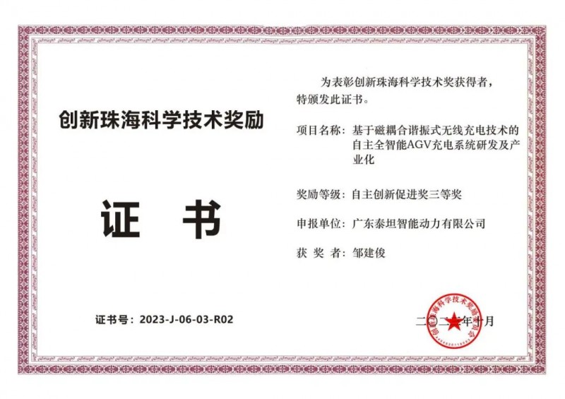 讓我們共同祝賀廣東泰坦智能動力有限公司獲得2023年度創新珠海科學技術獎-自主創新促進獎三等獎以及2023年度珠海市科技創新產品獎,并期待我們未來在新能源領域繼續取得更多突破和成就!