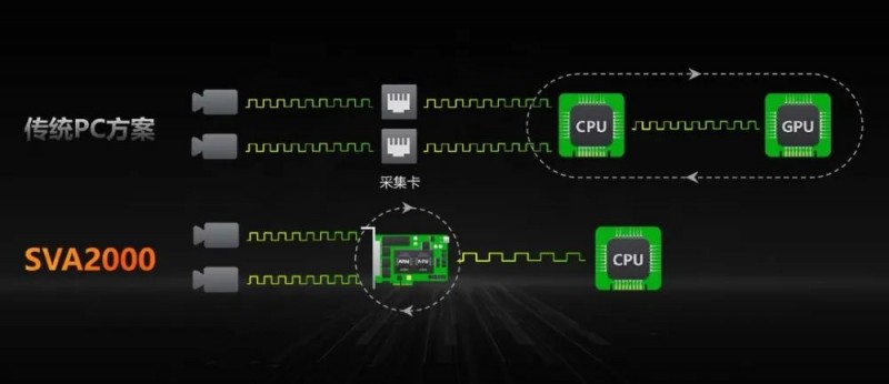 數(shù)據(jù)流無需經(jīng)過CPU,在SVA2000上即可完成全部視覺功能,CPU只在有需要時做少量的控制功能,大大降低了CPU負載,在某些應(yīng)用中甚至不需要CPU參與工作。