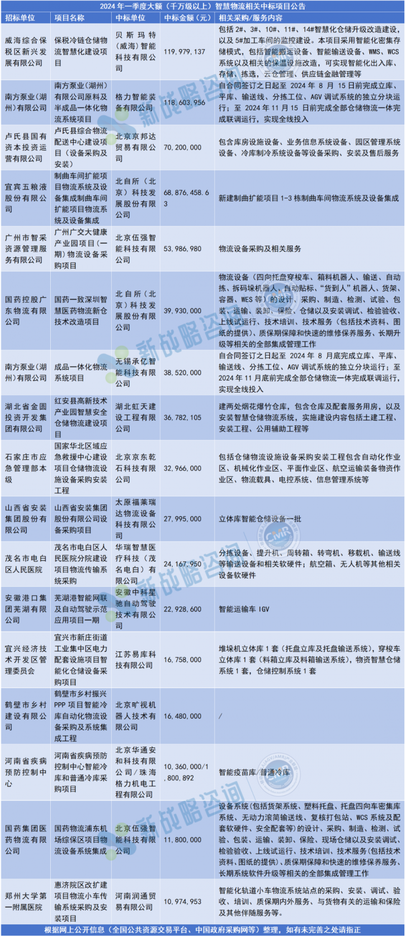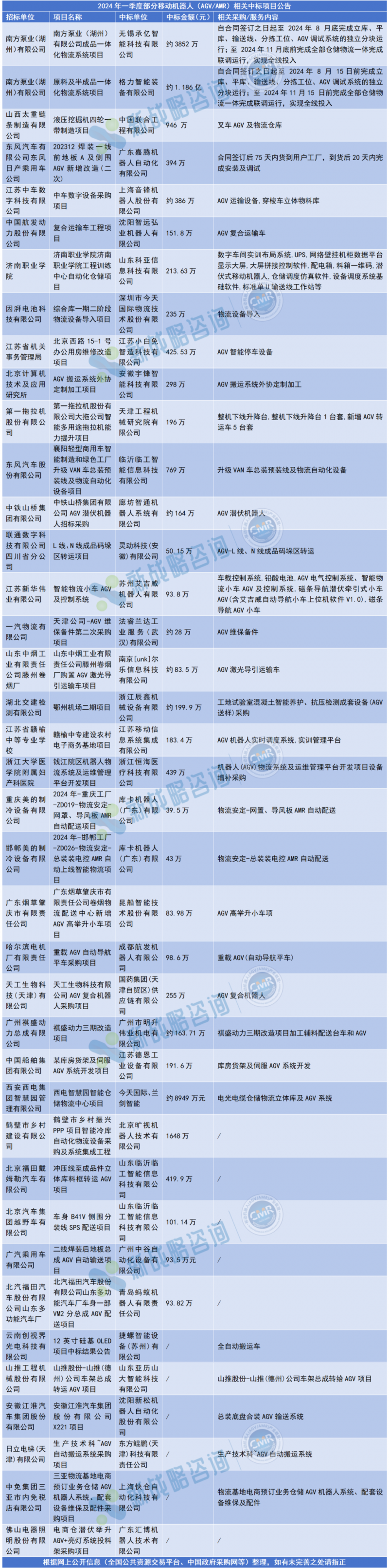 其中,一季度移動(dòng)機(jī)器人領(lǐng)域公開(kāi)發(fā)布超50項(xiàng)中標(biāo)公告。從移動(dòng)機(jī)器人領(lǐng)域的中標(biāo)項(xiàng)目分布情況來(lái)看,一季度中標(biāo)公告主要集中于汽車(chē)行業(yè)及工程機(jī)械行業(yè)。另?yè)?jù)新戰(zhàn)略移動(dòng)機(jī)器人產(chǎn)業(yè)研究所統(tǒng)計(jì),汽車(chē)行業(yè)在2024年一季度釋放超十億元標(biāo)的。其次是物流倉(cāng)儲(chǔ)業(yè)。此外,醫(yī)療衛(wèi)生、電子等行業(yè)也有較多招標(biāo)項(xiàng)目。