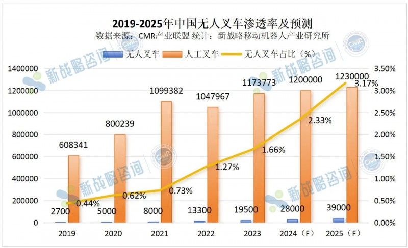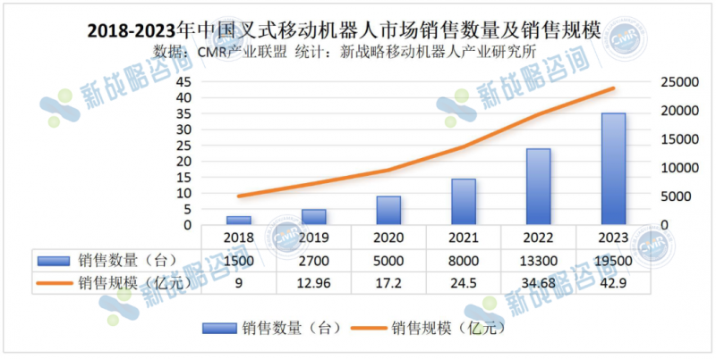 隨著智能搬運持續火熱,無人叉車市場近年來實現了快速增長。根據CMR產業聯盟數據,新戰略移動機器人產業研究所統計,2023年無人叉車銷量達19500臺,同比增長46.62%。
