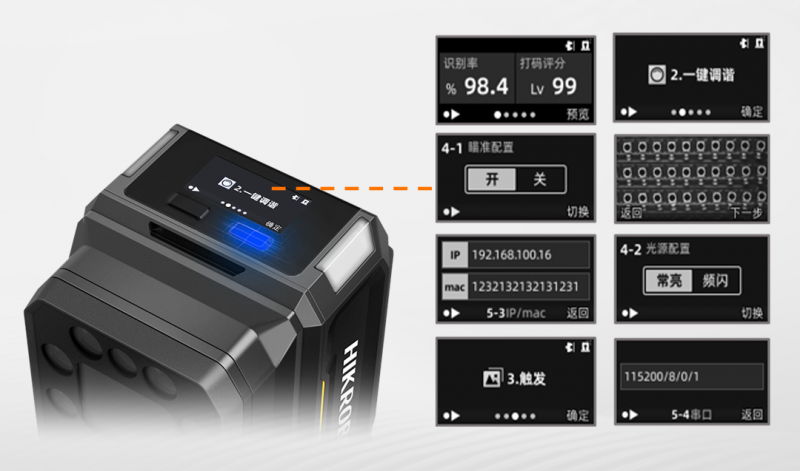 新增OLED顯示屏,通過與按鍵聯(lián)動(dòng),無需PC即可實(shí)現(xiàn)確認(rèn)主機(jī)信息、讀碼狀態(tài)實(shí)時(shí)查看、讀碼器參數(shù)輕松設(shè)定和快速?gòu)?fù)制等功能。