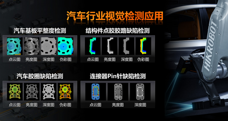 在汽車行業(yè)中,質(zhì)量缺陷檢測至關(guān)重要。海康機(jī)器人擁有成熟的產(chǎn)品和解決方案,可應(yīng)用于多個環(huán)節(jié),包括汽車基板平整度檢測、深度圖與點(diǎn)云圖的拼接,以及結(jié)構(gòu)件點(diǎn)膠膠路缺陷檢測和連接器Pin針缺陷檢測等。