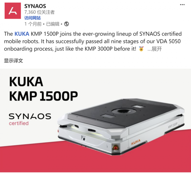 SYNAOS的官方認(rèn)證表明KMP 1500P移動(dòng)機(jī)器人可良好支持VDA 5050接口協(xié)議實(shí)現(xiàn)與第三方調(diào)度系統(tǒng)的系統(tǒng)對(duì)接,同時(shí)也彰顯了產(chǎn)品的可靠性、穩(wěn)定性和高標(biāo)準(zhǔn)。
