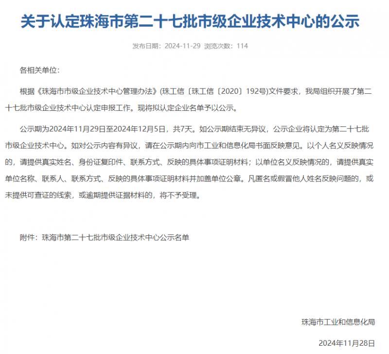 2024年11月29日,珠海市工業和信息化局發布了《關于認定珠海市第二十七批市級企業技術中心的公示》,廣東泰坦智能動力有限公司成功入選“珠海市第二十七批市級企業技術中心”,此次入選不僅是對公司過去努力的肯定,更是對未來發展的期許。