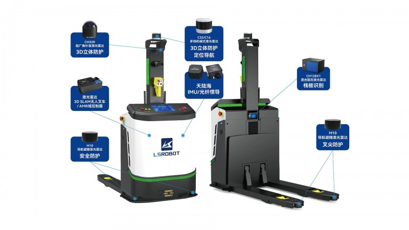 分別置于車頂、中、底及叉尖的激光雷達,從上至下覆蓋3D定位導航、立體防護、棧板識別、防撞及叉尖保護功能,同時又做到全方位感知低位至高位障礙物,實現360°無死角立體防護,預警潛在風險,確保安全無憂。