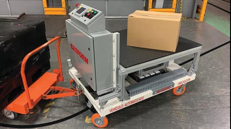 Creform為一家商用車零部件制造商設(shè)計并制造了一款牽引式自動導(dǎo)引車(AGV)。AGV拖著手推車在倉庫和裝配區(qū)之間來回運送生產(chǎn)零件。