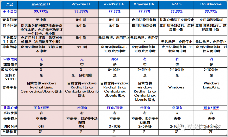 業界支持FT功能的有2家,為everRun FT和Vmware FT,從產品功能和成本分析考量,everRun更優;目前,業界無第三家支持FT功能的軟件,如下圖中MSCS,Double-take,均只支持HA功能,即業務會中斷,根據多方對比該科技有限公司選擇了洋米everRun Enterprise系統軟件,以下是對比圖: