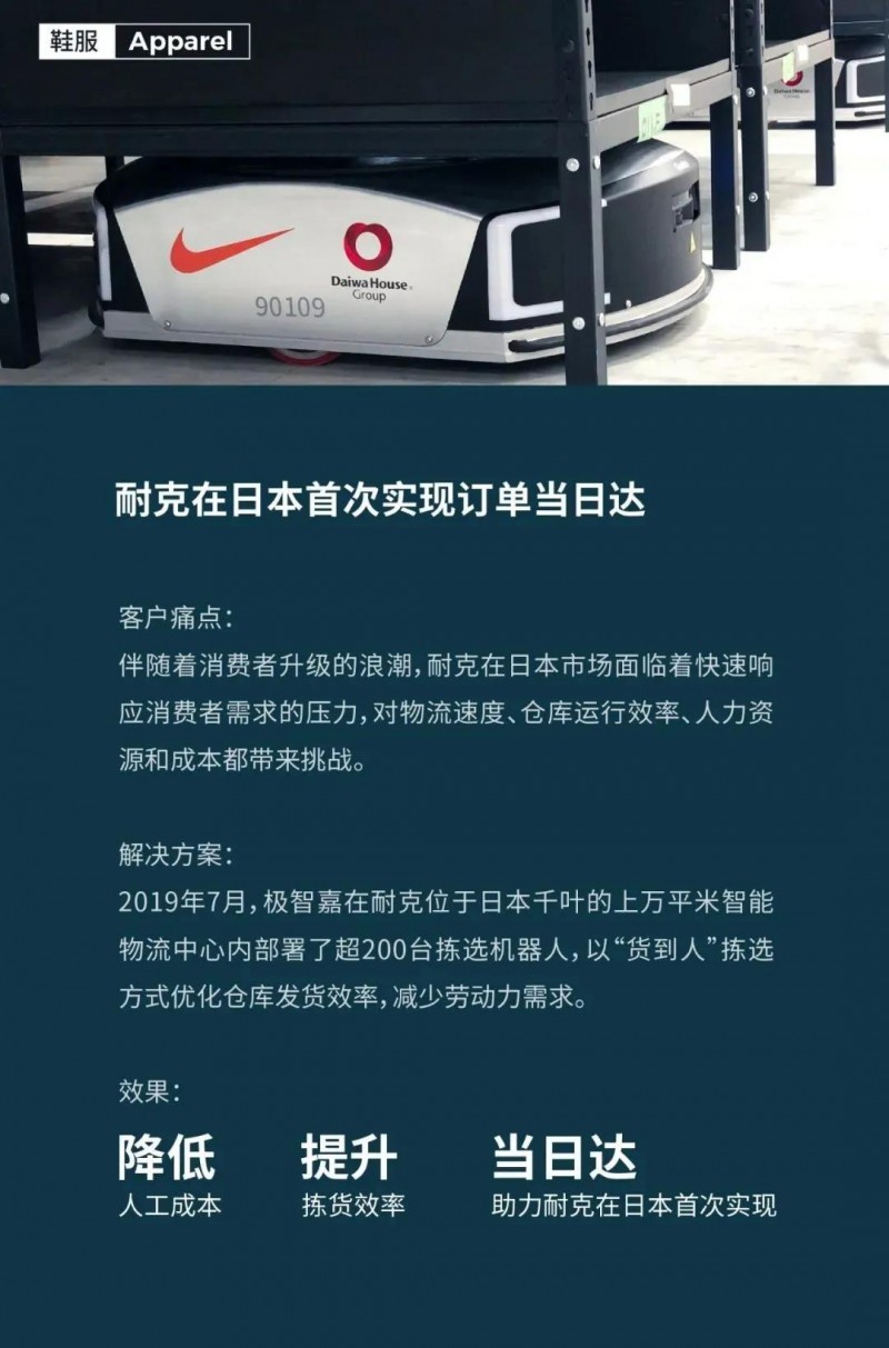 作為在鞋服行業(yè)擁有深厚行業(yè)積淀的智能物流方案專家,極智嘉已成功賦能耐克、安踏等行業(yè)龍頭品牌,實現(xiàn)物流智能升級,不斷助力客戶以數(shù)字化、精細化的倉配運營管理,連接碎片化、多邊化場景,提升消費者購物體驗。