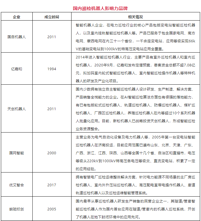 市場空間的廣闊吸引了更多的入局者,近年來,越來越多的機器人制造廠商投入到變電站巡檢機器人的設計、研發和銷售,據統計,目前國內已有25家左右具有一定規模的巡檢機器人制造廠商,并已研制出適應于不同環境條件的巡檢機器人。以下盤點了當前國內巡檢機器人市場一些影響力品牌,供大家參考!