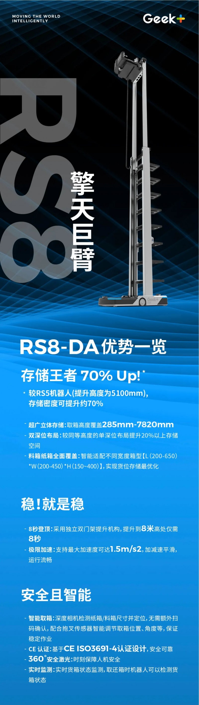 全球AMR引領者極智嘉(Geek+)今日重磅發布一款最大提升高度達8145mm的全新貨箱機器人RS8,刷新業內貨箱機器人高度極限!該機器人取箱高度范圍覆蓋從285mm至7820mm,實現超廣立體存儲。相比RS5機器人(提升高度為5100mm),RS8的存儲密度可提升約70%,再創貨箱到人高密度存儲天花板。