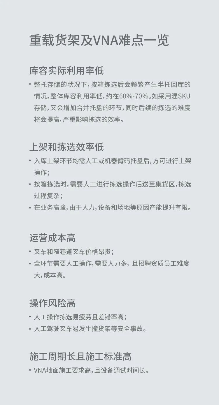 RS8-DA貨箱機器人主打服裝行業整箱存取場景,目前,該場景大多采用重載貨架配合人工叉車進行揀選,而這種形式多面臨以下難點: