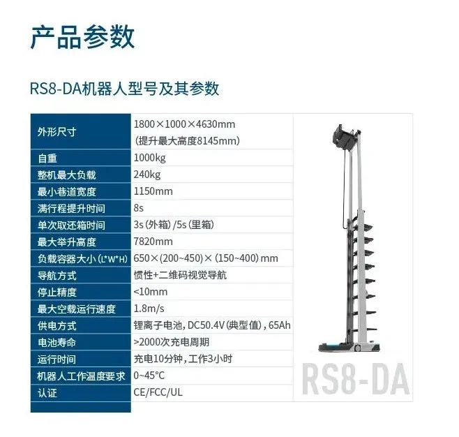 配置雙深可變寬度抱叉的機型為RS8-DA,其采用雙深位結構,配合智能調寬抱叉,可根據貨品自動調整抱叉寬度,同時可以根據實際貨箱尺寸分配存儲位置,保證最小貨位間隔。